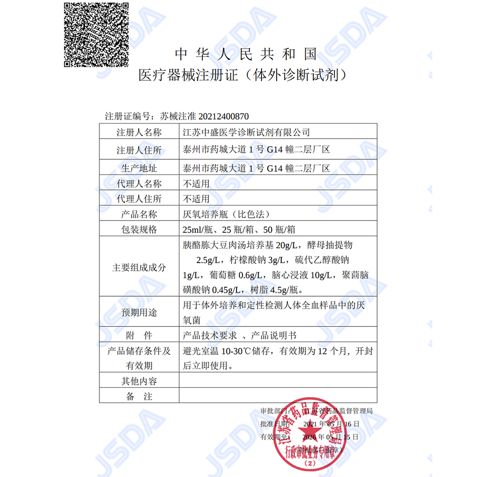 醫(yī)療器械注冊(cè)證(體外診斷試劑)-厭氧培養(yǎng)瓶(比色法)